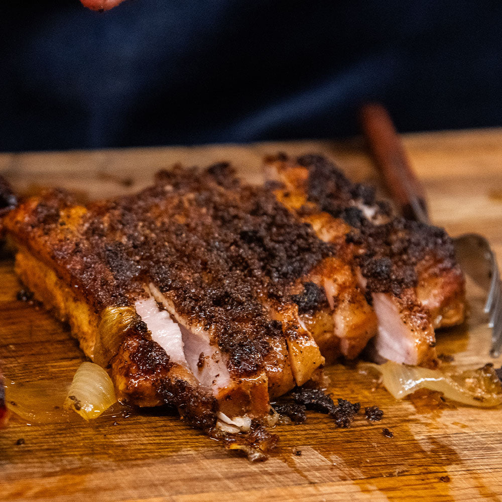 Pork Belly con piel crocante, salsa macha y guacamole.