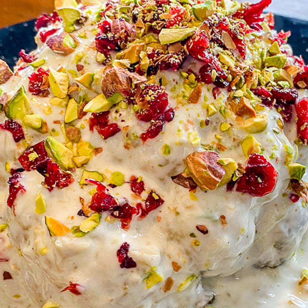Coliflor Rostizada con salsa de queso, pistaches y arándanos.