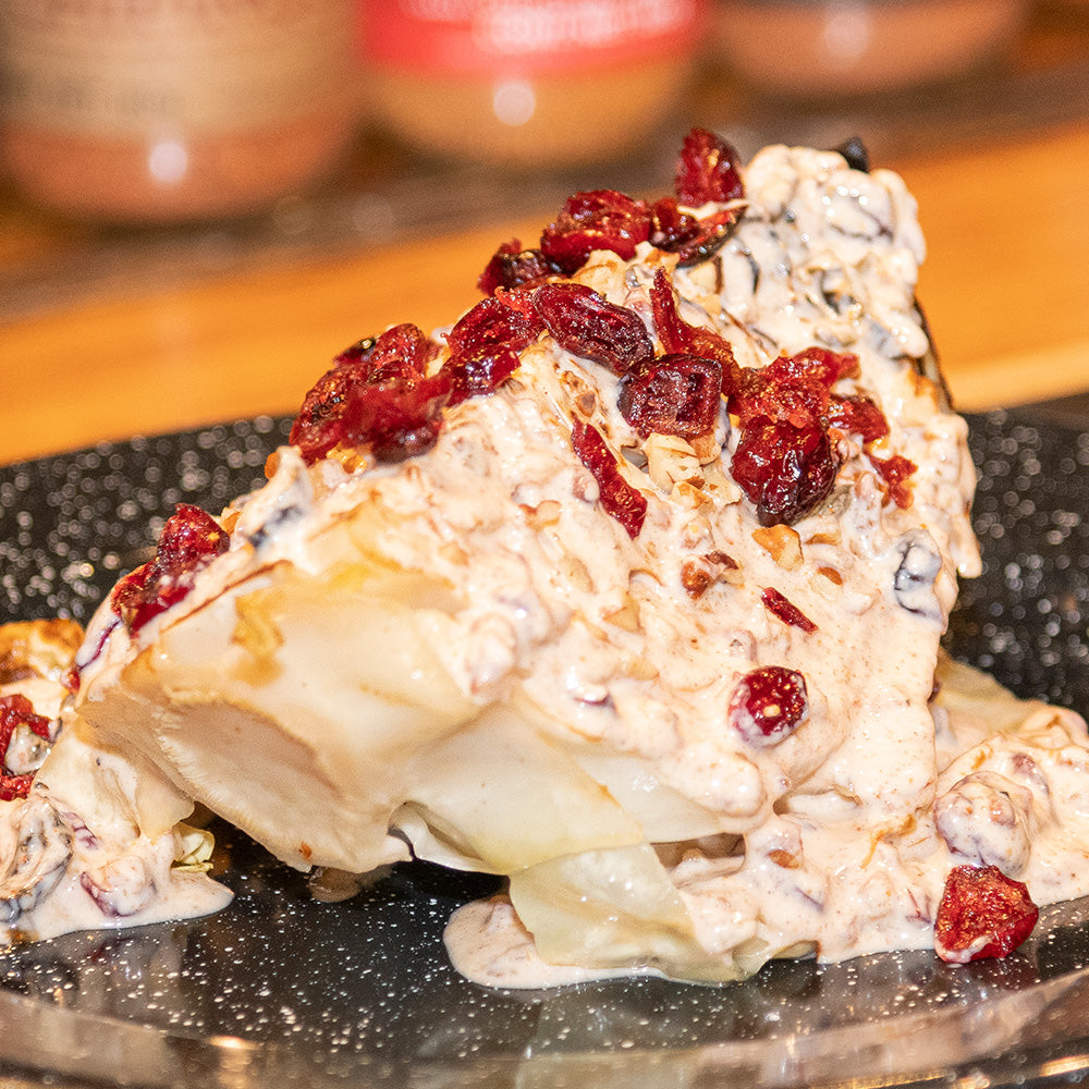 Dulce de fresa a la plancha con yogurt griego ahumado en frío con romero y crumble de galleta.