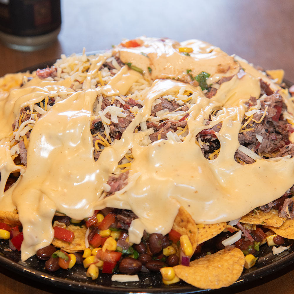 Nachos Tex-Mex de brisket con salsa de queso y frijoles.