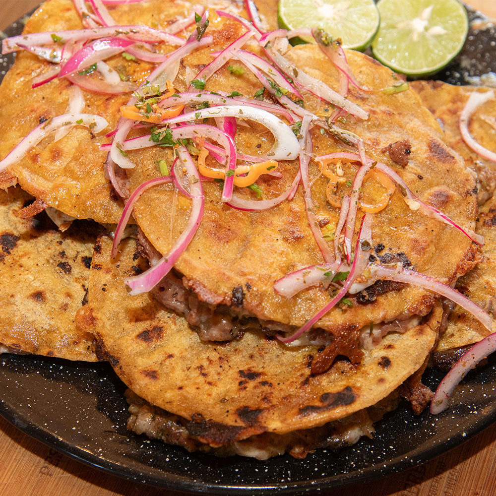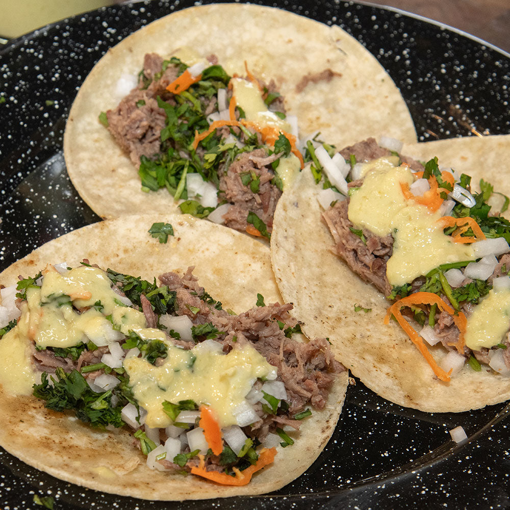 Empalme de pecho asado en salsa verde y cebolla encurtida con habanero.