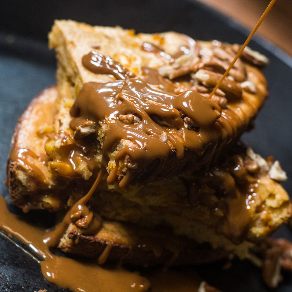 Pan de elote ahumado con salsa de caramelo al mezcal.
