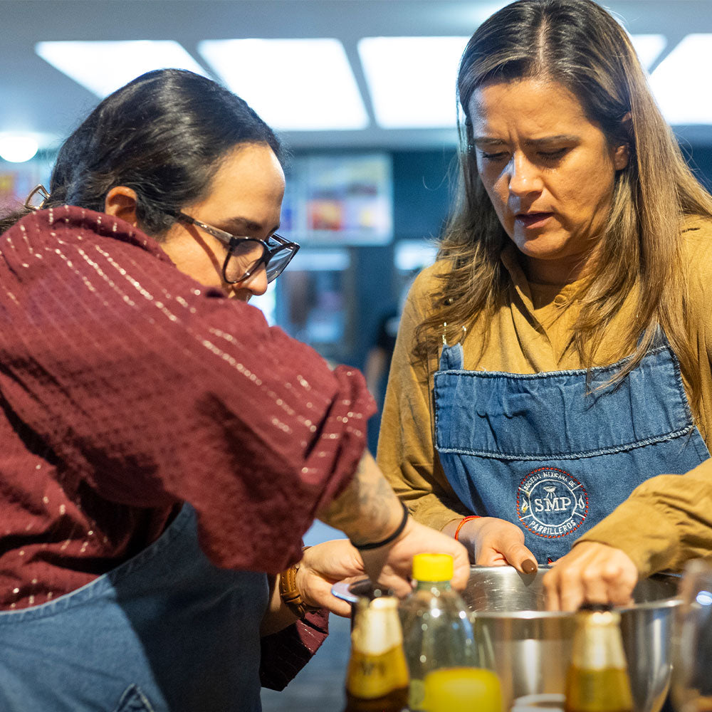 Existen varias mesas con hasta 8 personas, los participantes se encargan de las preparaciones de cada receta guiados por el Maestro Parrillero, quién se encarga de la explicación teórica y guía práctica para cada tiempo.