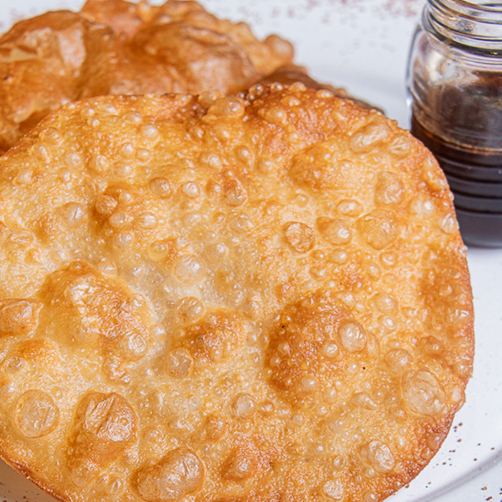 Tostada de harina frita con queso crema y tocino caramelizado.