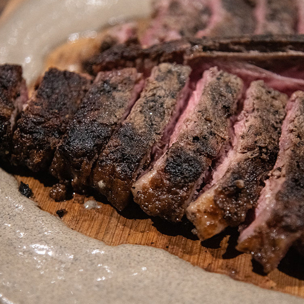 Porterhouse ahumado en sellado inverso con arugula fresca y salsa cremosa de hongos.