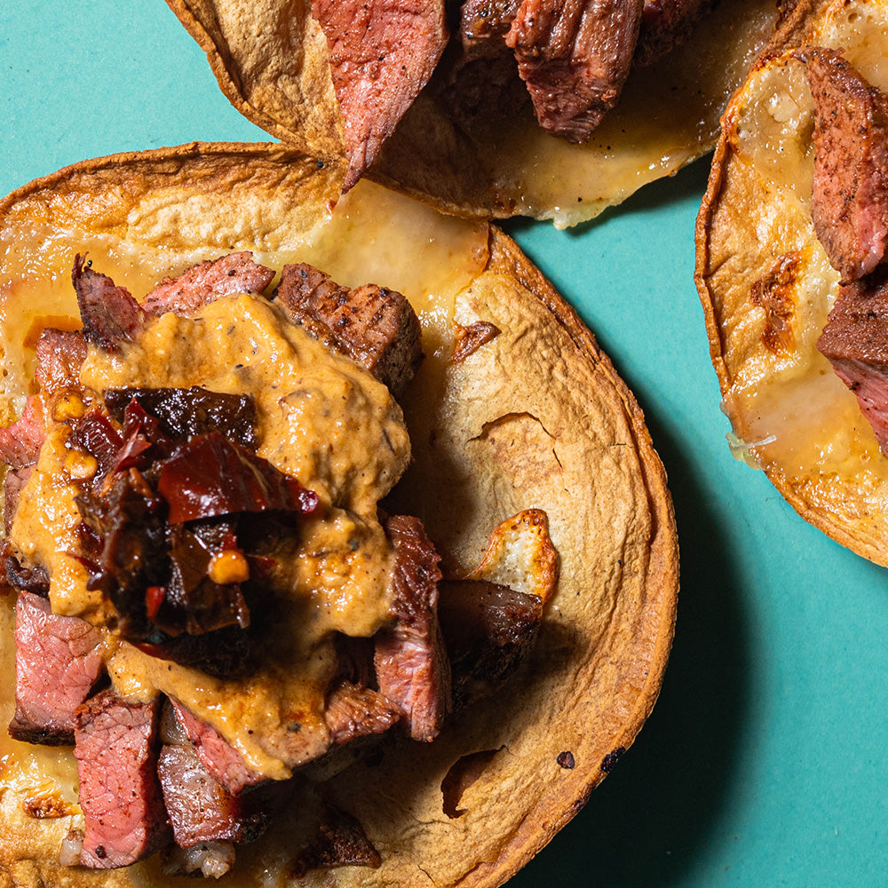 Picaña en costra de cenizas, pure de papa con queso parmesano y chimichurri de pimiento rojo ahumado.