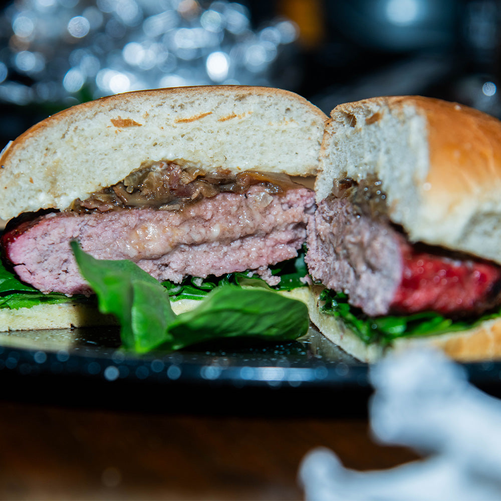 Hamburguesa de picaña con ketchup casera de tomate cherry y manzana roja.