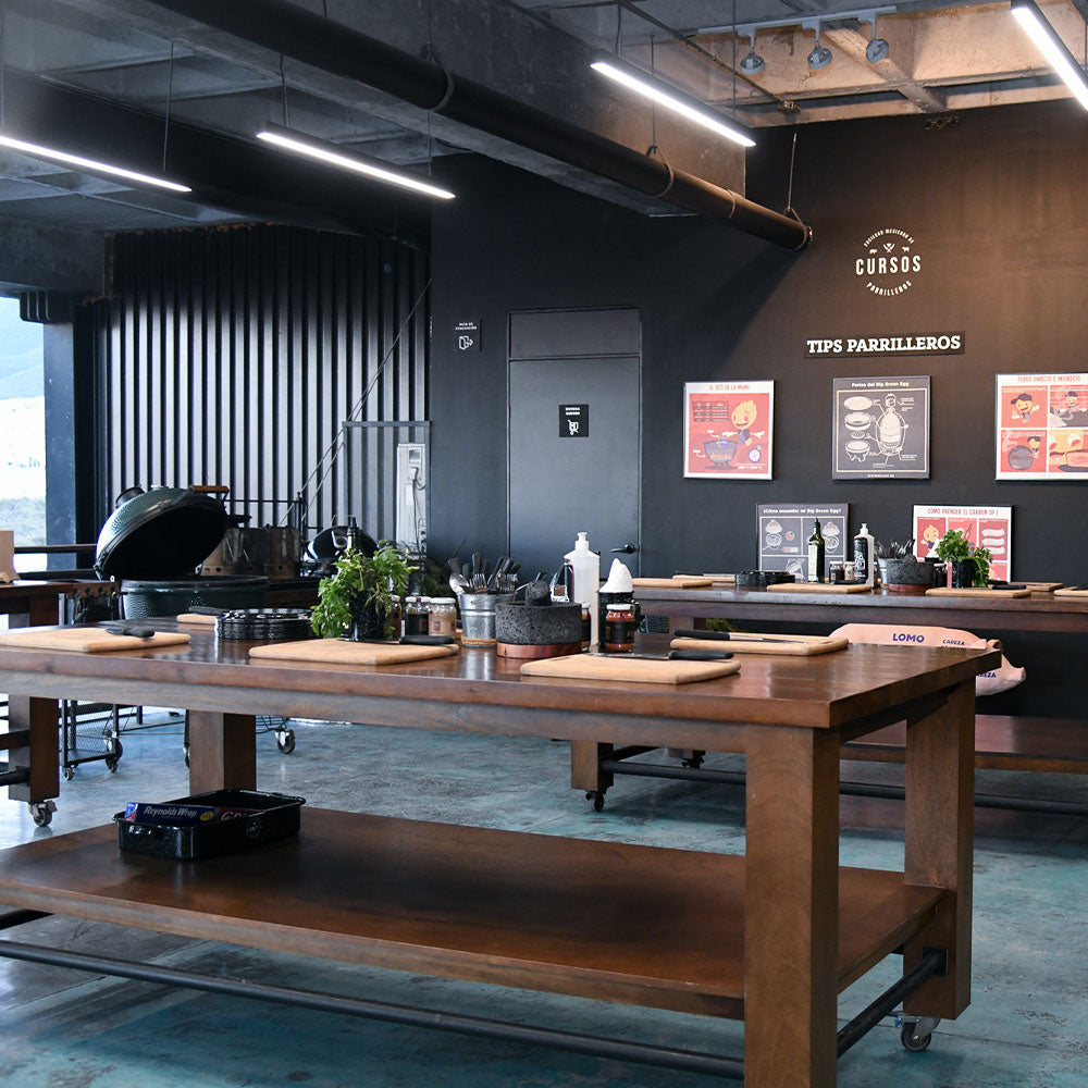 Existen varias mesas con hasta 8 personas, los participantes se encargan de las preparaciones de cada receta guiados por el Maestro Parrillero, quién se encarga de la explicación teórica y guía práctica para cada tiempo.