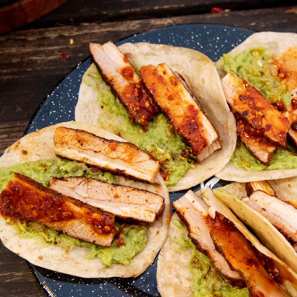 Taco de matambre de cerdo con salsa de piña tatemada.
