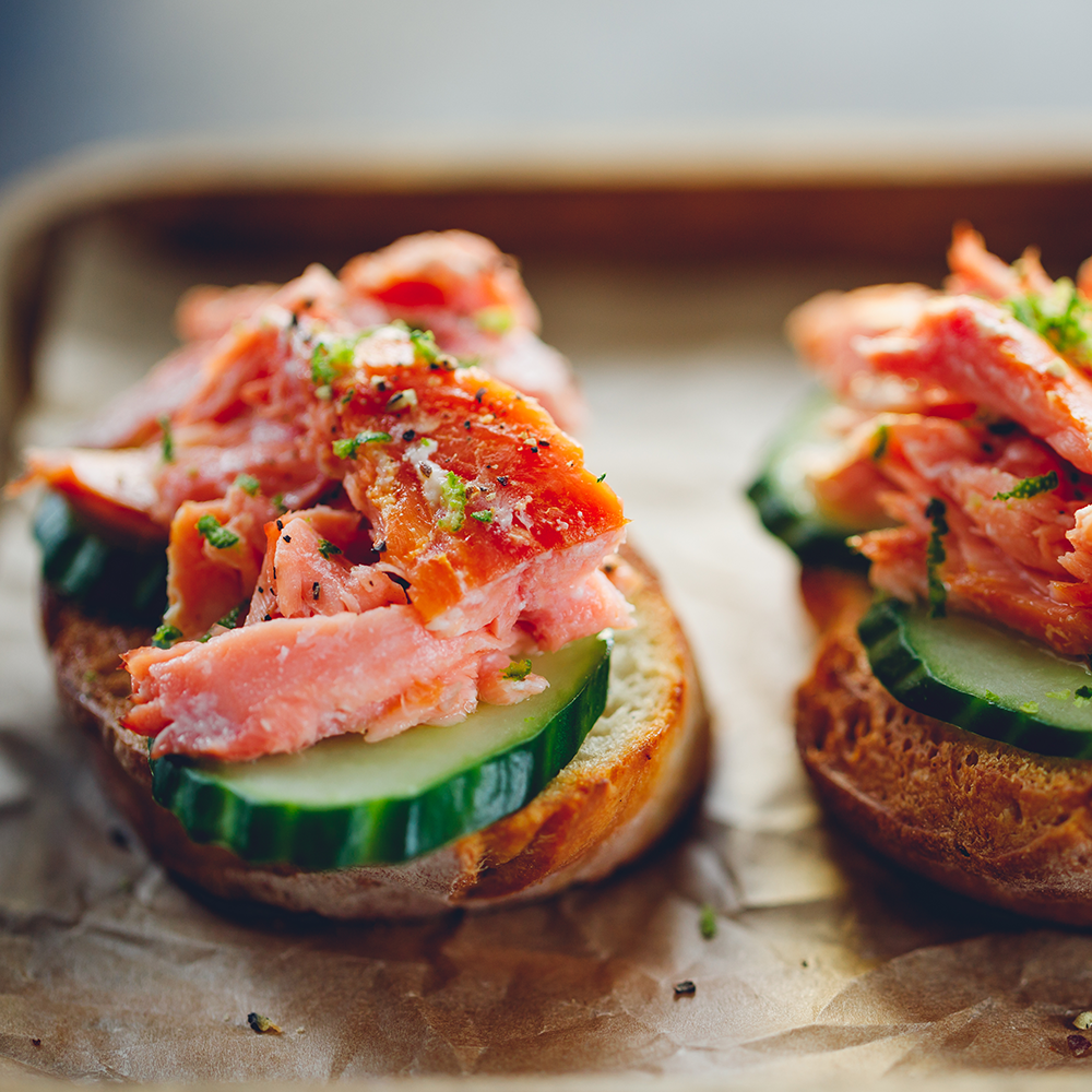 Tostada de salmón estilo cajun y salsa de pepino y habanero.