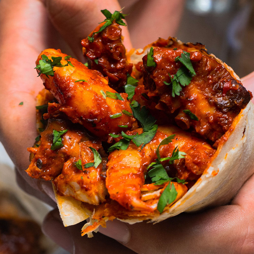 Taco de pulpo adobado con queso y salsa de aguachile negro.
