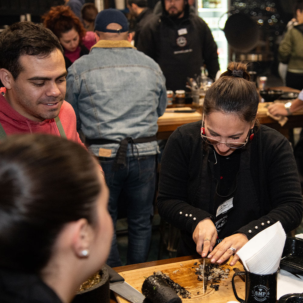 Existen varias mesas con hasta 8 personas, los participantes se encargan de las preparaciones de cada receta guiados por el Maestro Parrillero, quién se encarga de la explicación teórica y guía práctica para cada tiempo.