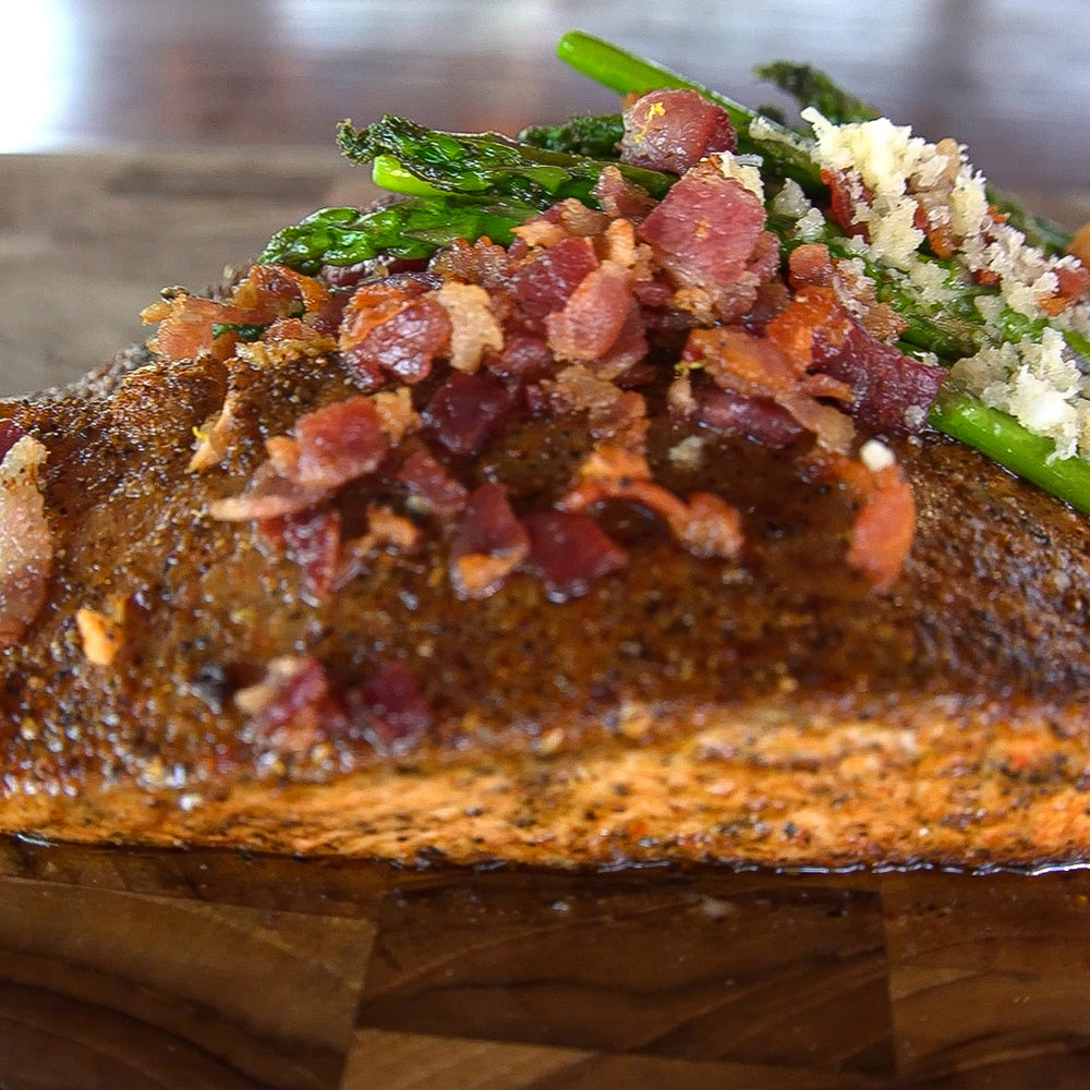 Salmón asado con costra de tocino, ajo y almendras con esparragos asados bañados con salsa de queso permesano.