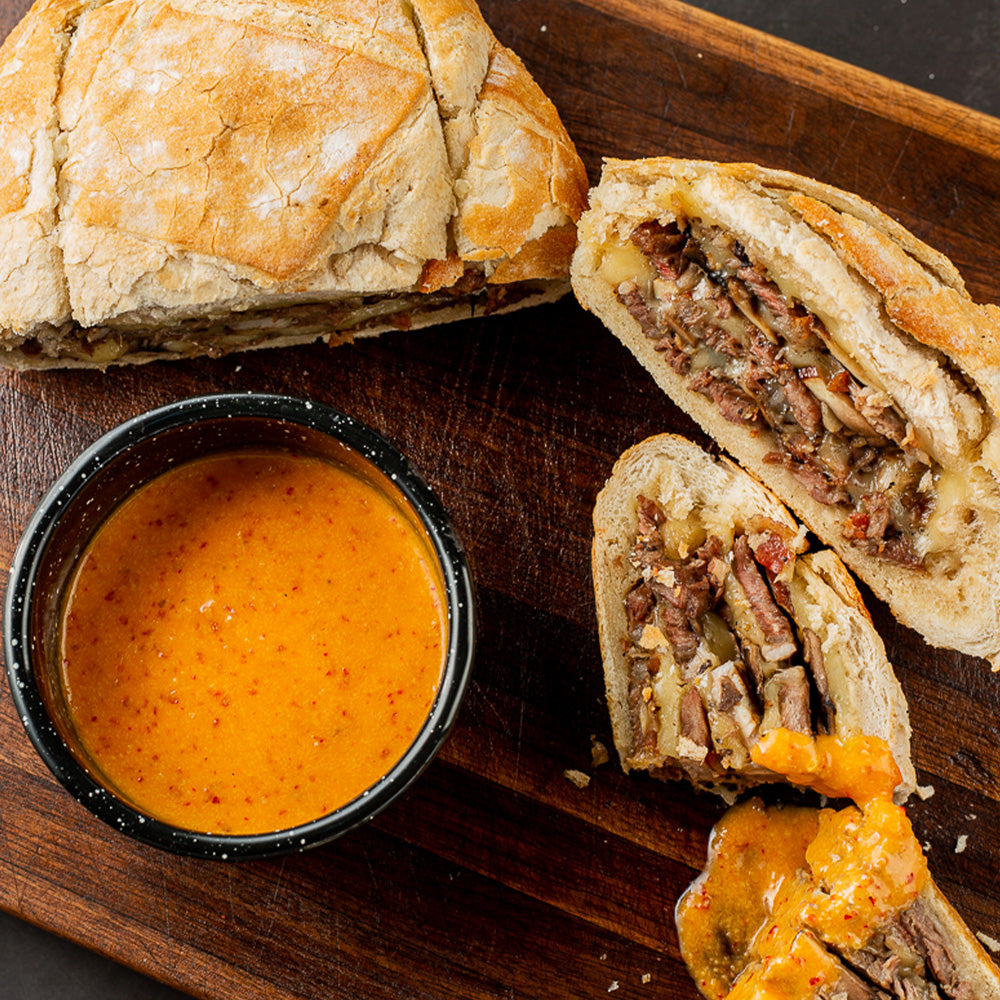 Torta de picaña rostizada con salsa de queso y cebolla caramelizada.