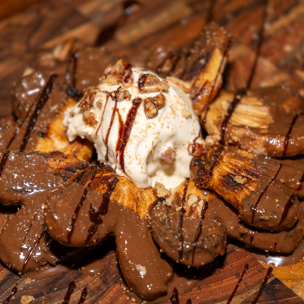 Orejas asadas con jarabe de piloncillo y helado de vainilla.
