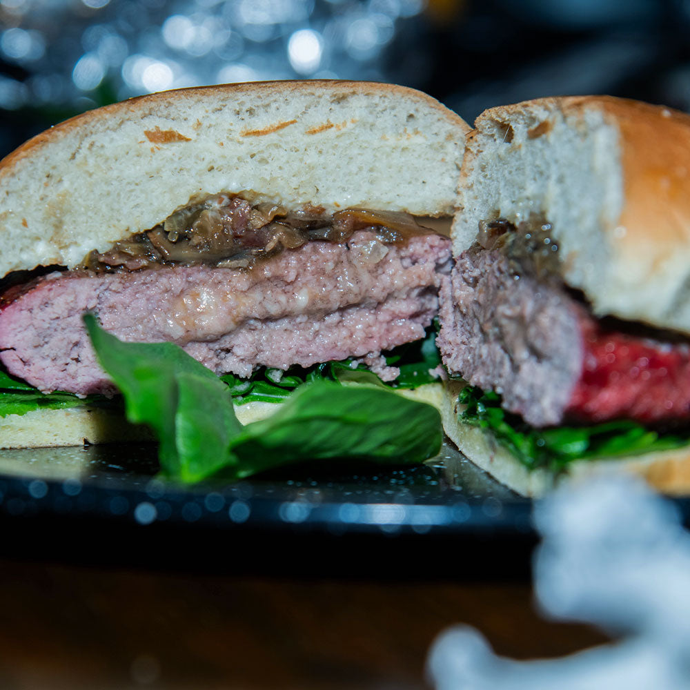 Hamburguesa de picaña con mermelada de cebolla con tocino y queso brie ahumado.