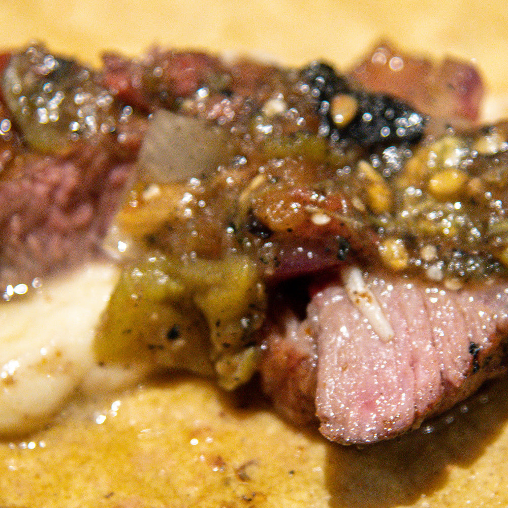 Rib eye asado a la vuelta y vuelta con papas fritas y salsa de chile piquín