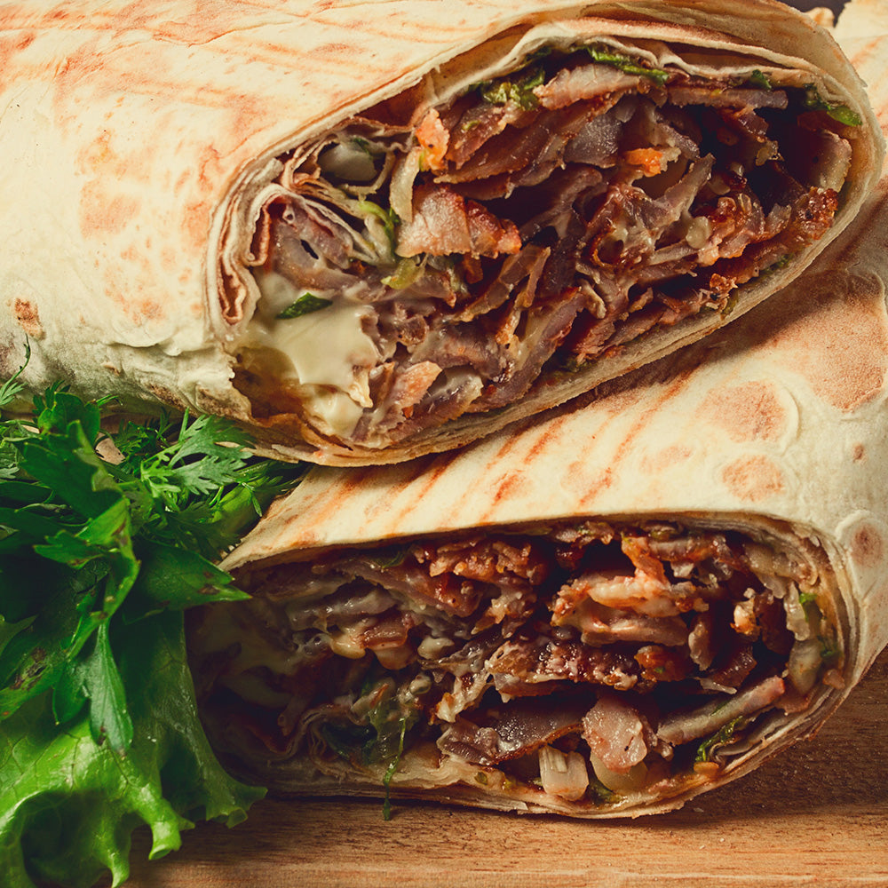 Wrap de Picaña en pan pita con vegetales frescos, puré de jocoque con aguacate y salsa macha