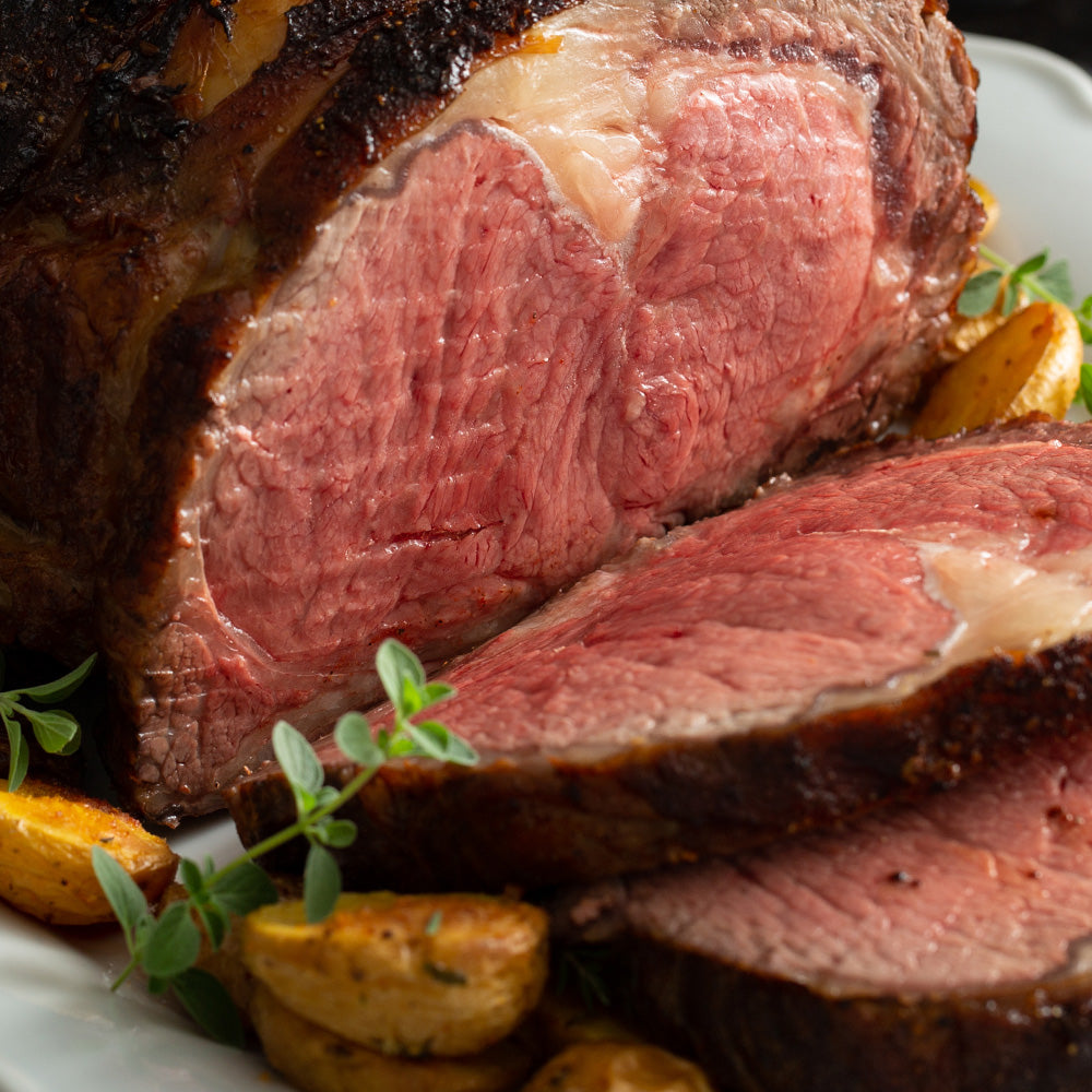 Prime rib atado ahumado en costras de cenizas con café, ensalada fresca y espárragos salteados