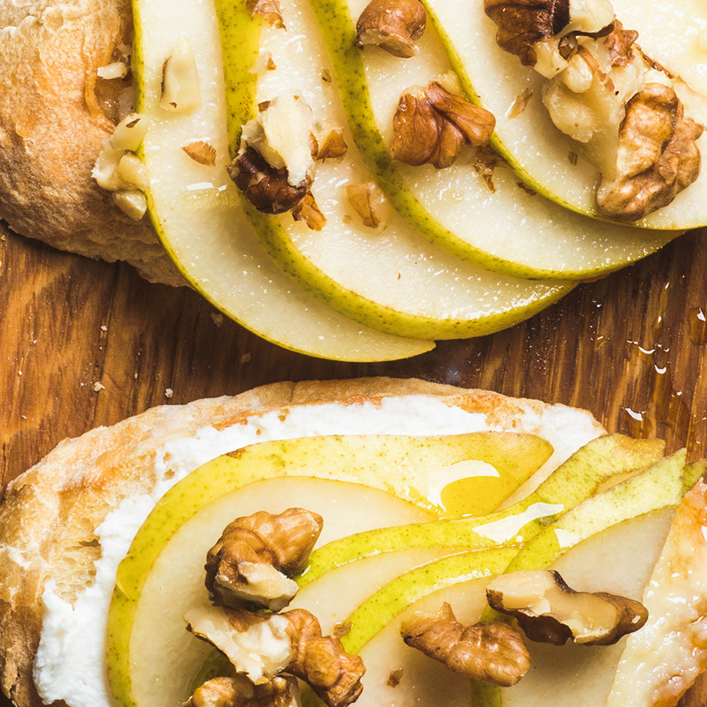 Peras horneadas con relleno de queso azul, nuez y miel multiflora SMP