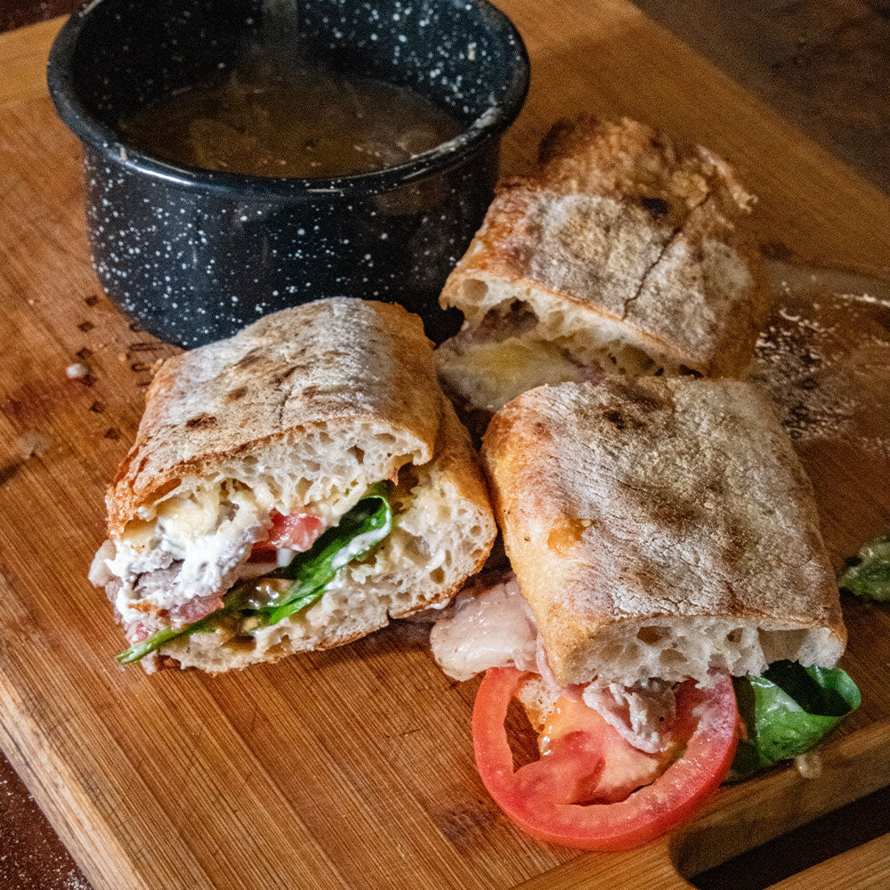 French Dip de Rib Eye con sopa de cebolla caramelizada.