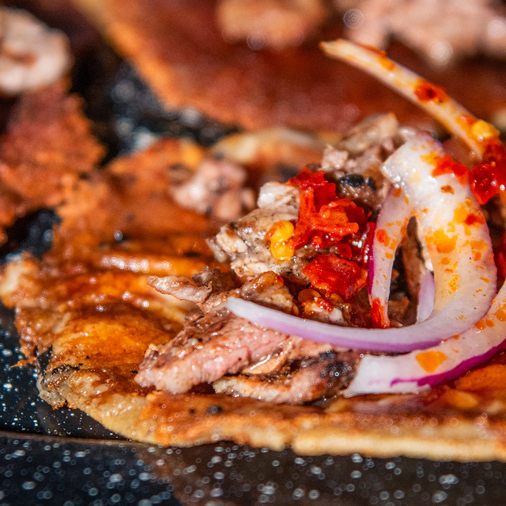 Costra de gaonera de rib eye con salsa de aguacate y ensalada fresca de jalapeño rojo