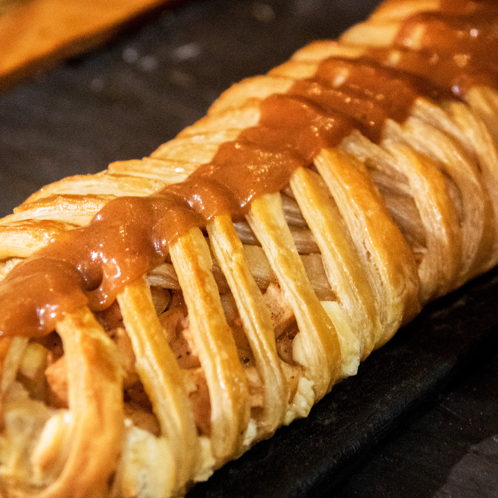 Trenza de hojaldre rellena de queso crema ahumado y duraznos