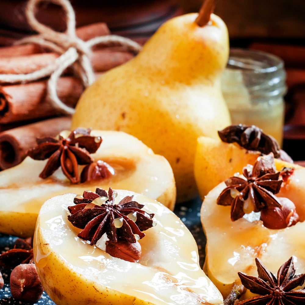 Peras ahumadas con reducción de vino tinto y cardamomo