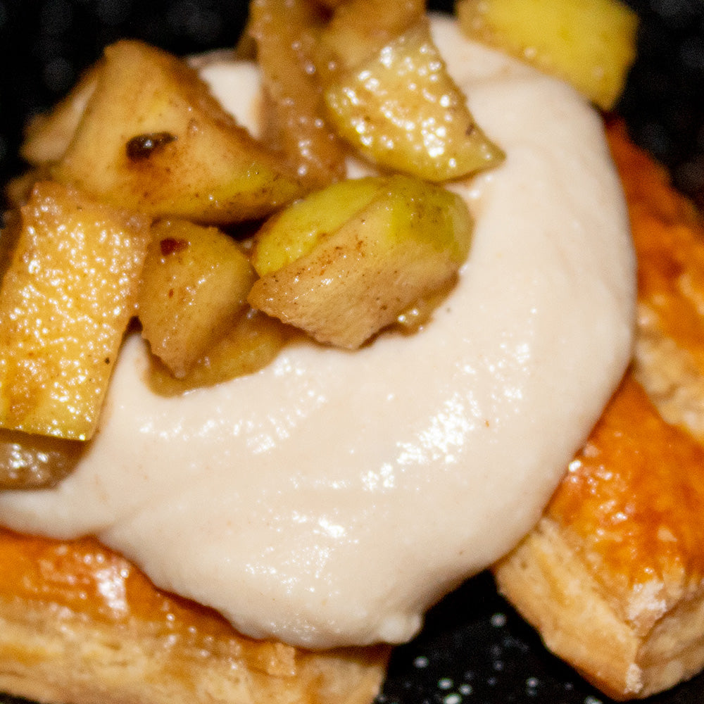 Tartaleta de duraznos asados con rub del postre y romero.