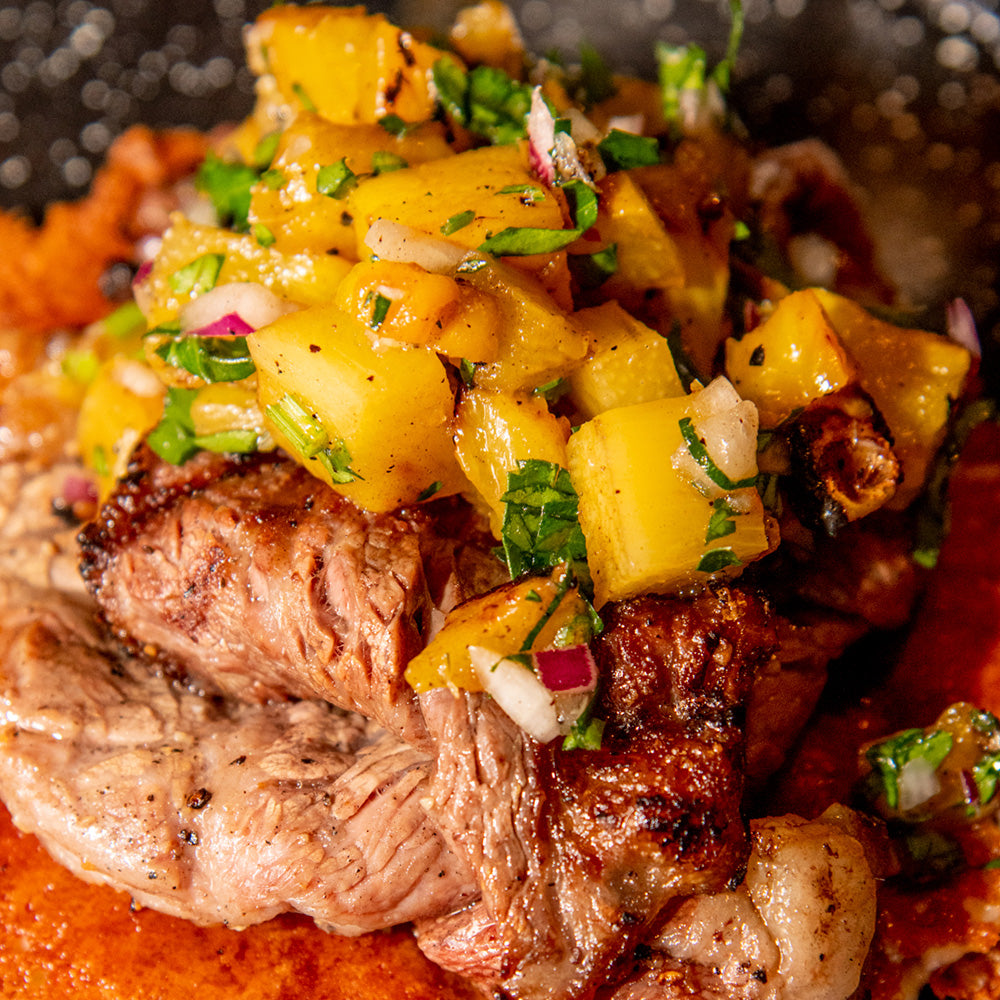 New York de 1.5 pulgadas en aguachile negro cítrico de serrano tatemado.