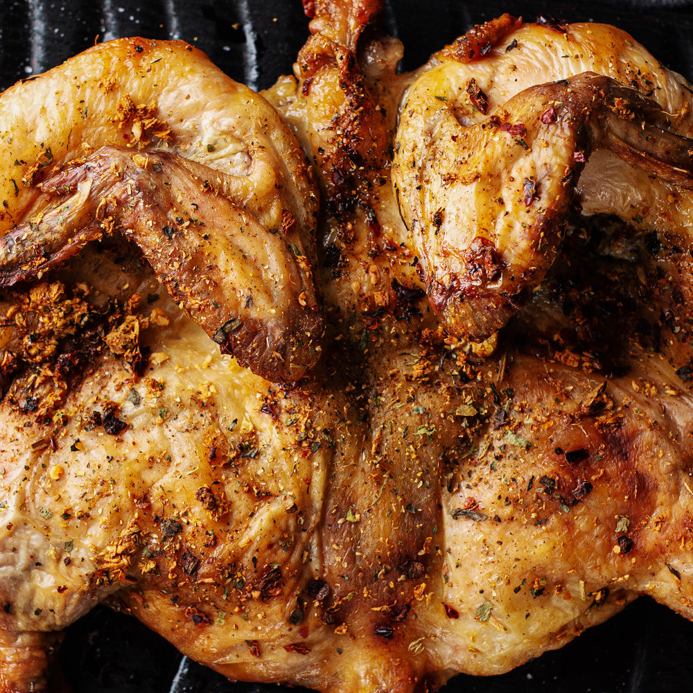 Pollo sentado en sartén de hierro vaciado con papas en reducción balsámica y romero.