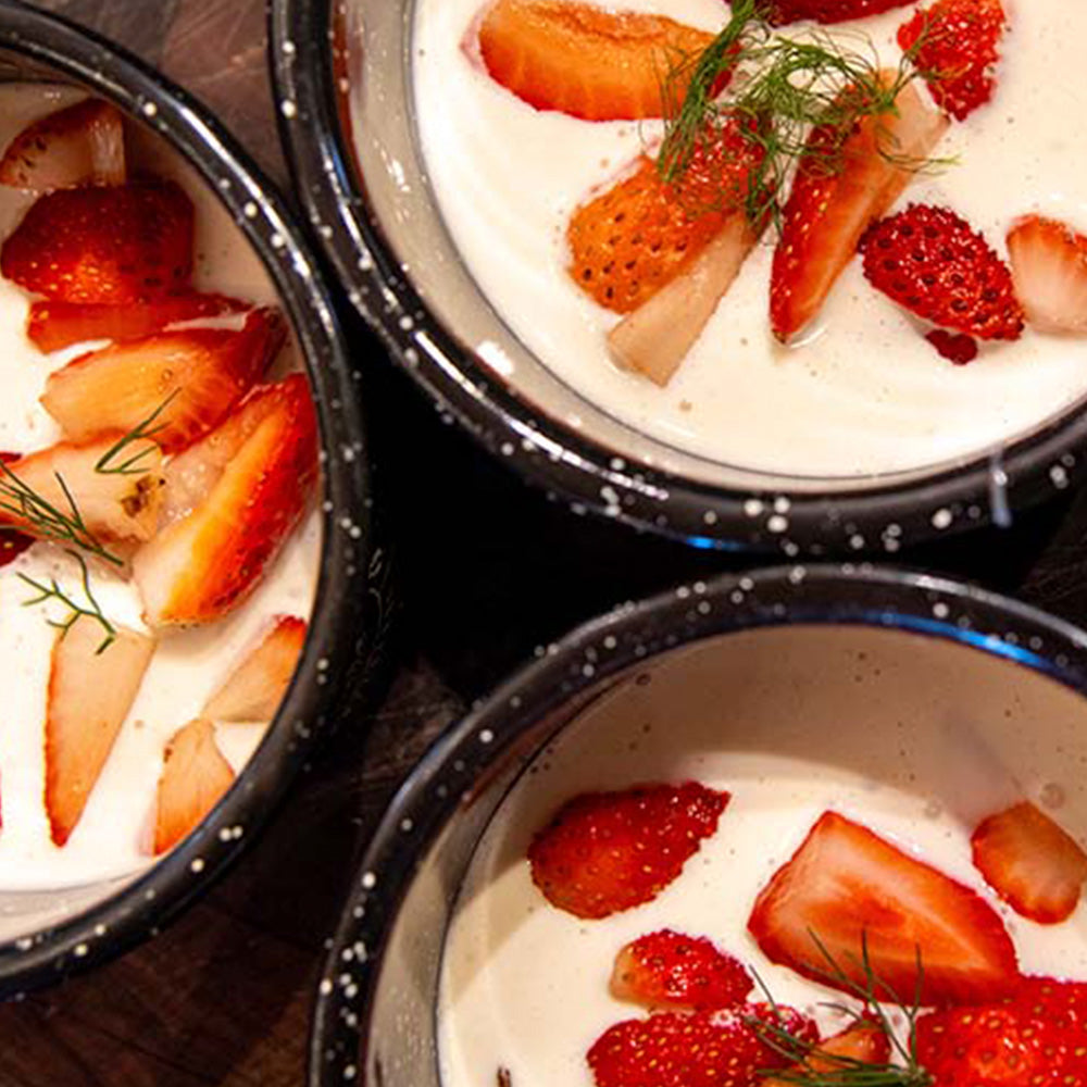 Fresas con crema batida ahumada en frío con albahaca y astillas de durazno.