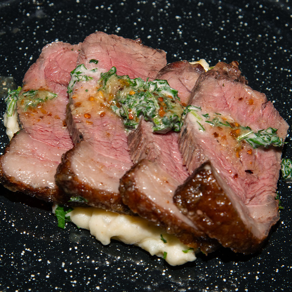 Picaña de res asada con técnica tradicional, servida sobre una cama de puré de papa suave