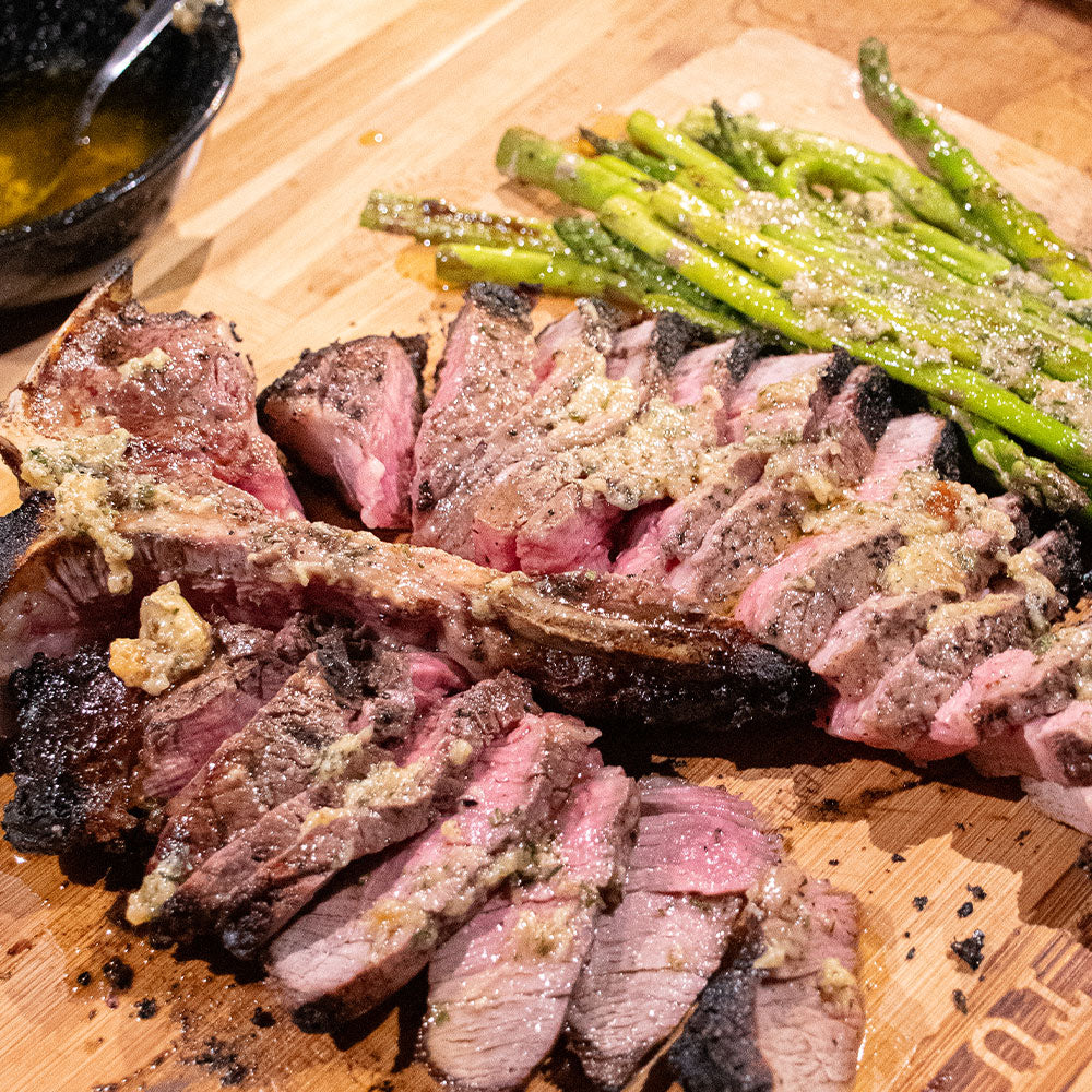 Porterhouse de 1.5” a la cavernícola acompañado de coles de Bruselas salteadas al piquín.