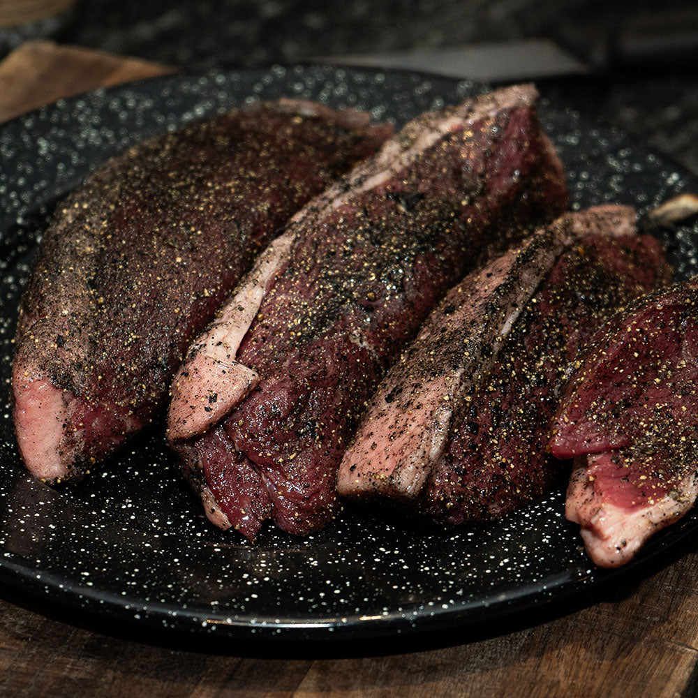 Picaña de 1.5” en sartén de hierro vaciado con pasta cremosa de champiñones.