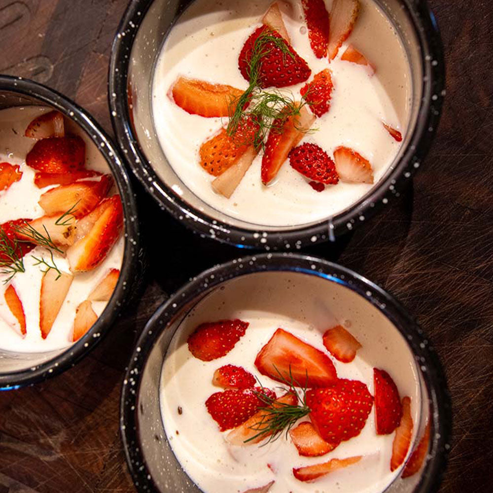 Fresas con crema batida ahumada en frío con romero y albahaca.