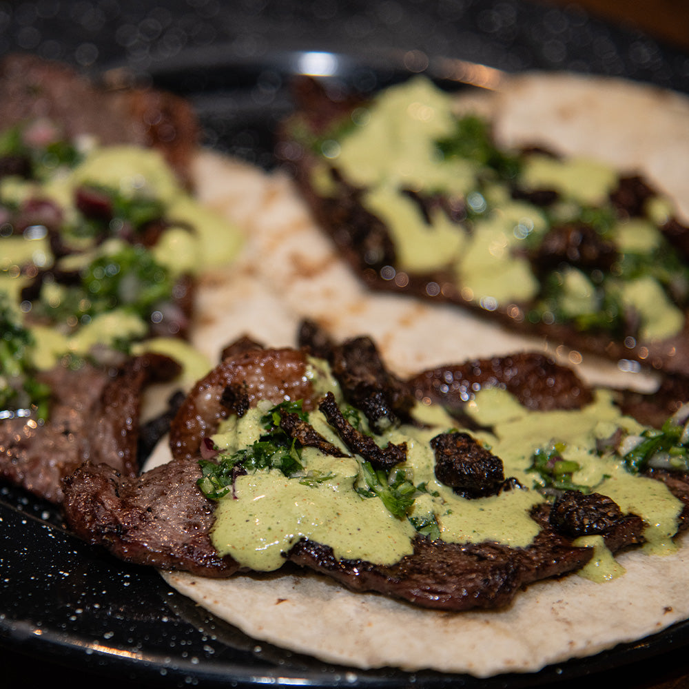 Taco de picaña con costra de queso menonita y chimichurri de piquín fresco.