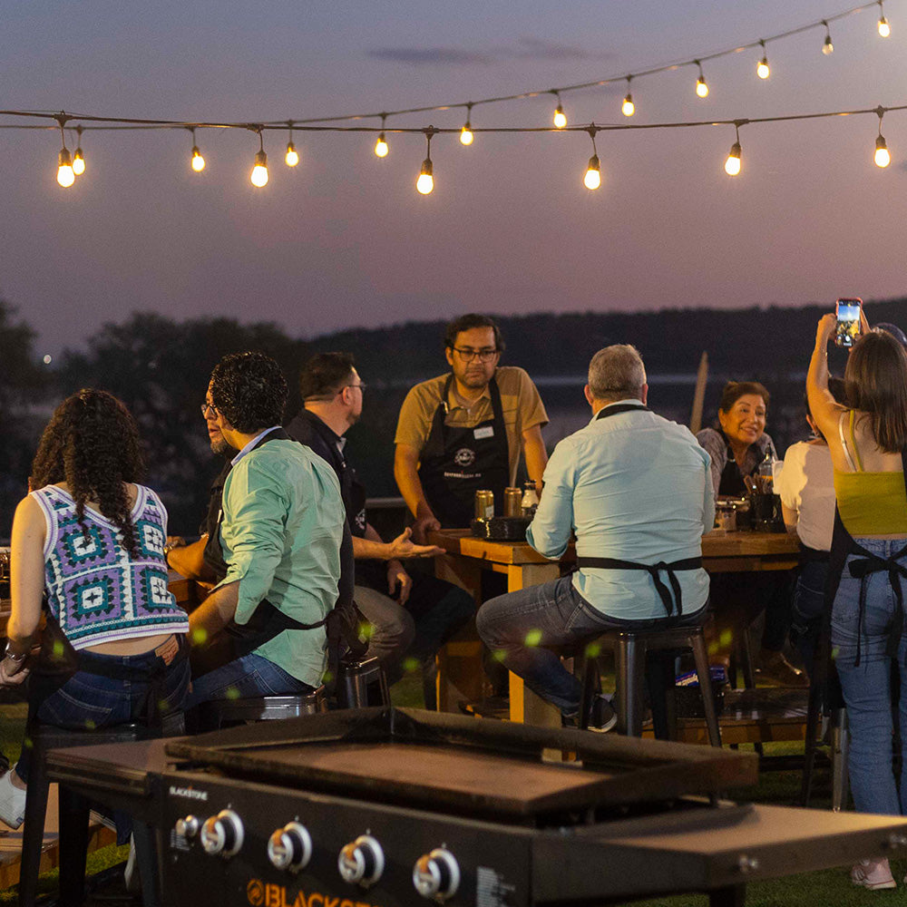 Existen varias mesas con hasta 8 personas, los participantes se encargan de las preparaciones de cada receta guiados por el Maestro Parrillero, quién se encarga de la explicación teórica y guía práctica para cada tiempo.