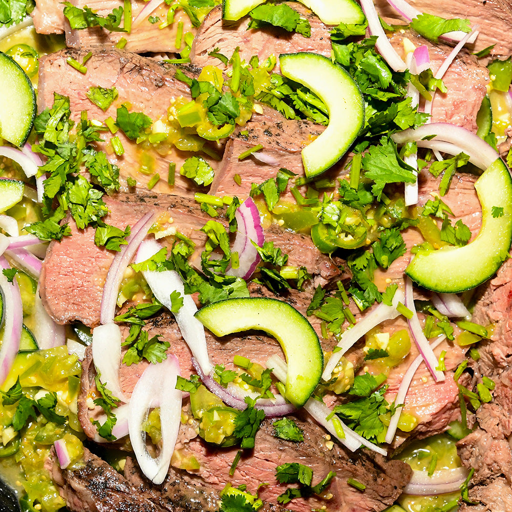 Ribeye de 1.5” asado a la vuelta y vuelta con salsa acida de chile piquin.
