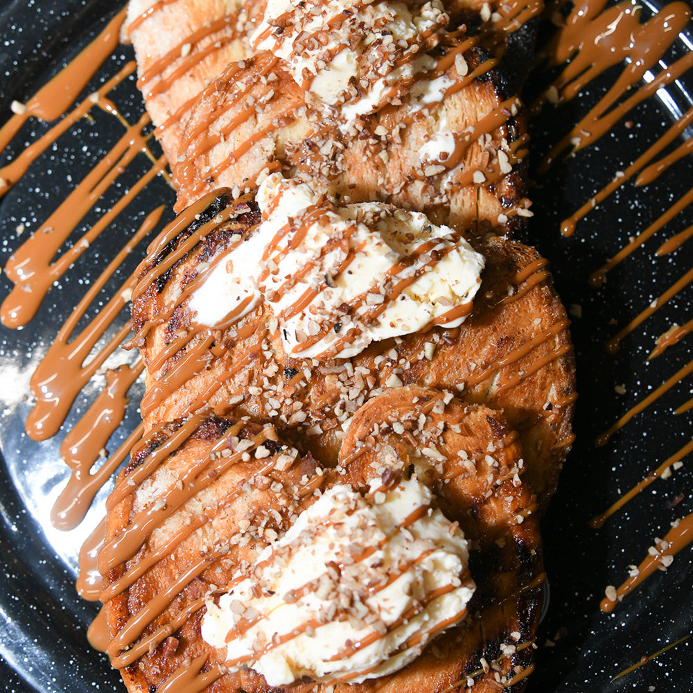 Hamburguesa de ribeye ahumada con queso manchego y aderezo de ajo confitado.