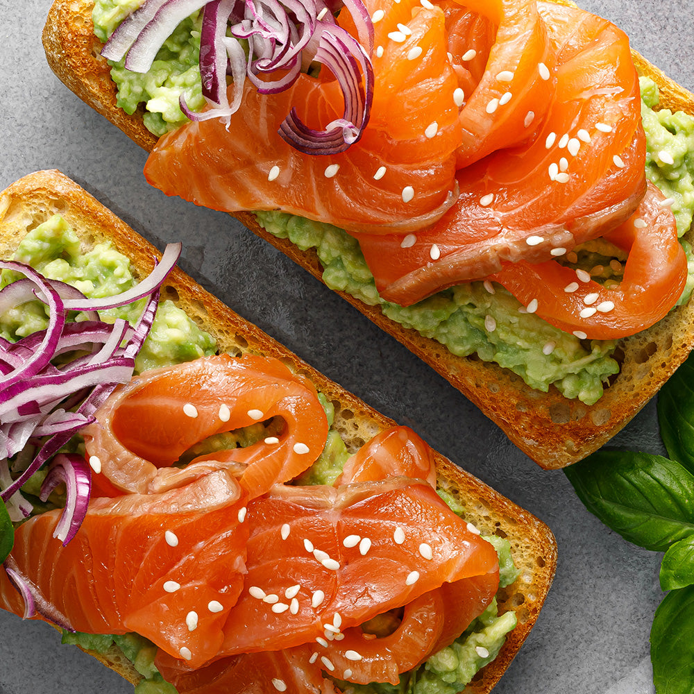 Toast de salmón ahumado glaseado con miel- habanero con base de queso de cabra